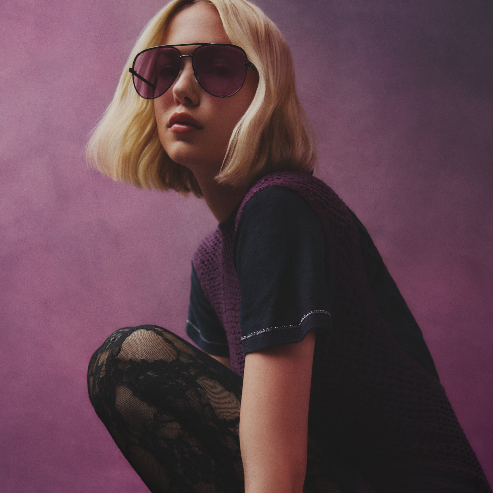 Get ready for the bonfire bash AFTER PARTY with colorful lenses. With a catty brow and a deep amethyst lens, this shade will keep you on trend before and after the sun has set. Embrace a playful Y2K mood with your favorite crochet and denim layers.